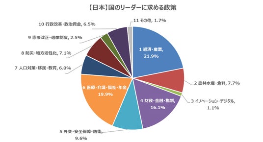 日本においては、経済・産業(21.9%)、医療・介護・福祉・年金(19.9%)、財政・金融・税制(16.1%)の3項目で約6割を占める結果となりました。岸田首相の任期満了に伴う自民党総裁選の投開票が9月27日に迫り、政治資金問題を受けた派閥の解散後初めての総裁選に向けて、各候補者の政策に注目が集まっています。