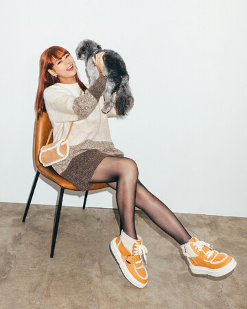 ハンサムな印象のシャツとジャケットに、女性らしい気品漂う「レース&メッシュ アンクルブーツ」を合わせたコーディネート。「ビーズドハンドル サテンルーシュドバッグ」は、サテン素材とシルバーのボールチェーンの組み合わせが、シンプルながら洗練された印象を演出します。西内まりやさんの愛犬ロロちゃんは、バッグと同じくシルバーのビーズをあしらった「メタリック ビーズドエンベリッシュドペットカラー」を着用。愛犬とのリンクコーディネートも楽しめます。