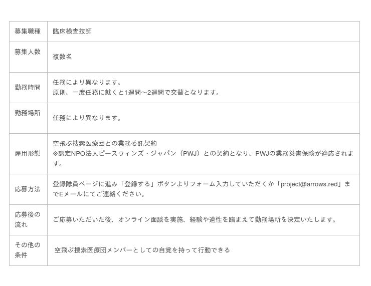 そこで、空飛ぶ捜索医療団”ARROWS”の一員として活動をしてくださる臨床検査技師の登録派遣隊員を急募することとしました。