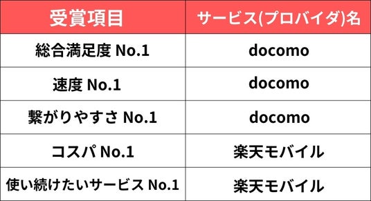 「総合満足度」「速度」「繋がりやすさ」でdocomoが満足度No.1を受賞しました。また、「コスパ」「使い続けたいサービス」では楽天モバイルが満足度No.1でした。