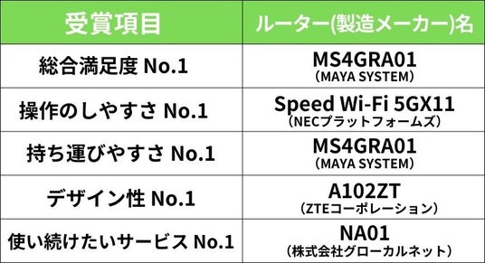 「総合満足度」と「持ち運びやすさ」の項目で受賞したのは、MS4GRA01でした。また、「操作のしやすさ」ではWiMAX端末のspeed Wi-Fi 5GX11となり、デザイン性では、MS4GRA01でした。そして、「使い続けたいサービス」では、NA01という結果となりました。