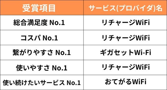「総合満足度」「速度」「使いやすさ」では、全てリチャージWiFiが満足度No.1と三冠を獲得しました。また、「繋がりやすさ」では、ギガセットWi-Fiが受賞しました。「使い続けたいサービス」では、おてがるWiFiがNo.1という結果でした。