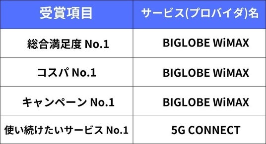 「総合満足度」「コスパ」「キャンペーン」では、BIGLOBE WiMAXが満足度No.1を受賞。「使い続けたいプロバイダ」では、5G CONNECTがNo.1となりました。