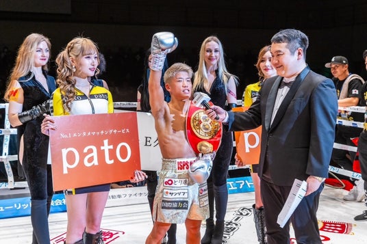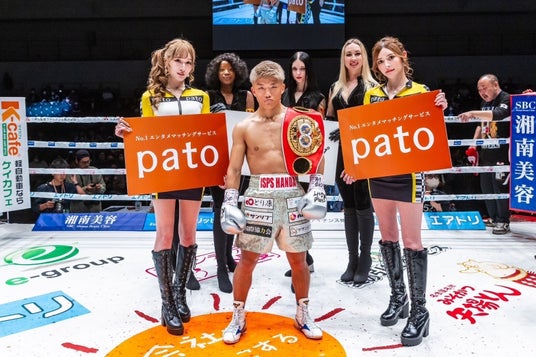 勝者のプロボクシングIBF世界ミニマム級王者、重岡銀次朗選手の両脇にpatoキャストが華を添えました。