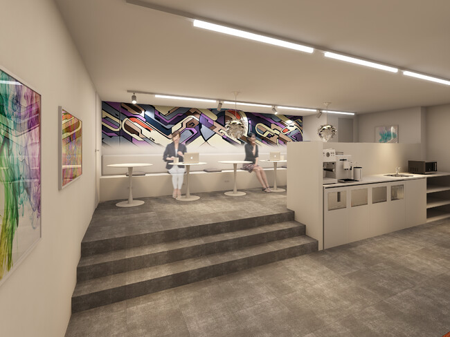 川崎市在住のアーティストとコラボレーションし、川崎という地域の特徴をアートで表現したウォールアートを、オフィスのデザインに取り込みました。現代アートとスタイリッシュな仕様の空間が、利用者のより充実した時間の創出に役立つことを願います。