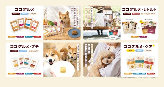 現在ココグルメのラインナップは、主力商品である冷凍タイプの「ココグルメ」4メニューに加え、小分けタイプでトッピング利用に最適な「ココグルメ・プチ」4メニュー、常温保存が可能で持ち出しや防災用のストックに便利な「ココグルメ・レトルト」2メニュー、療法食と一緒に使えて食べつきに配慮した「ココグルメ・ケア」の4ラインがあります。