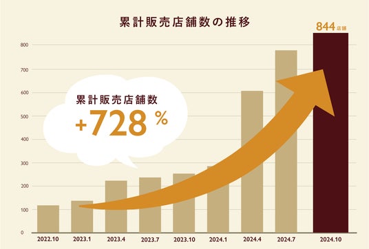 2022年9月の大手小売店さまとのお取引開始から、全国のペット専門店、スーパー、ドラッグストア、ホームセンター、コンビニなど多様な小売店様との提携を進め、約2年間で116店舗から728%成長の844店舗(2024年10月31日時点)にまで拡大しています。特に2024年1月以降は店舗数の拡大が顕著になっています。