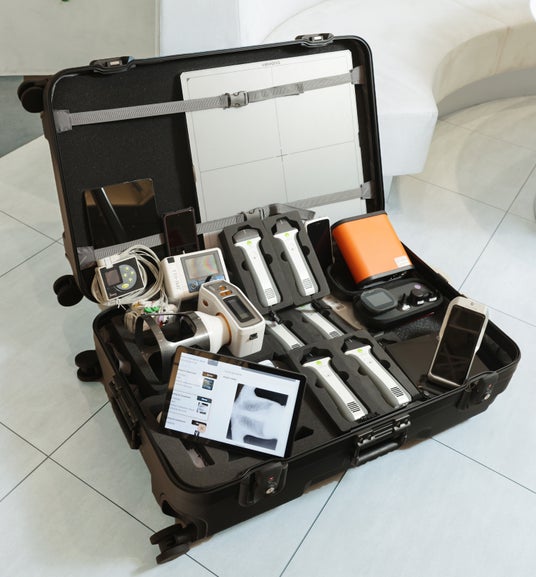 日本は四方を海に囲まれた島国であり、各プレートの境界に位置しているという地理的・気候的要因から、海外の国と比べて地震や台風、豪雨、大雪、土砂災害、津波などの自然災害が発生しやすい災害大国です。そのため、防災対策や災害時の迅速な対応が特に重要視されています。離島・採掘場・船上といった医療アクセスが必ずしも容易ではない環境や、大規模な自然災害など有事の際、迅速に医療インフラを整えられるのがJMCです。JMCには、各種軽量ポータブル医療機器と各医療機器と連携した診療記録システム「JoinNotepad(ジョインノートパッド)」、医療関係者間コミュニケーションアプリ「Join(ジョイン)」を搭載したスマートフォンまたはタブレットが入っており、遠隔で専門医の診断や助言を得ることができます。