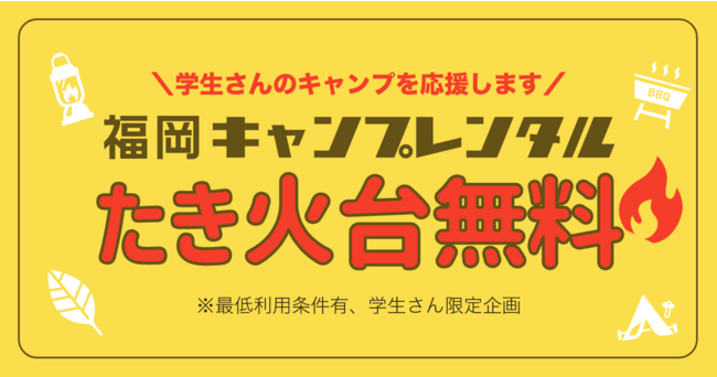 キャンプ道具レンタルサービス「福岡キャンプレンタル」を運営するキャンプ女子株式会社(本社:福岡市、代表:橋本華恋、以下キャンジョ)は、6月6日(月)~8月31日(水)の期間、学生の皆様を対象とした「たき火台レンタル無料キャンペーン」を開催します。