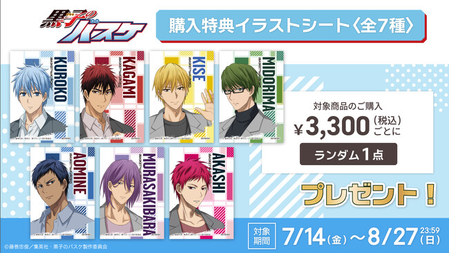 販売期間中(2023/7/14~8/27)、アニメ『黒子のバスケ』オリジナルグッズの合計注文金額3,300円(税込)お買い上げごとにランダムで特典イラストシート(全7種)を1点プレゼントいたします。