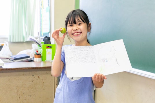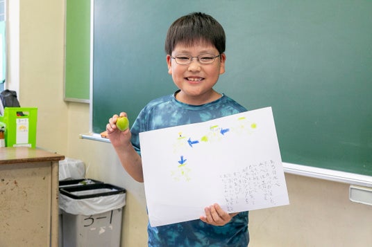 青梅の香りを吸い込んだら、桃みたいないい香りがしました。みんなでとった青梅は、これから梅ゼリーにします。出来上がったらどんな味になるのか、イメージしながら物語を作るのが楽しかったです!