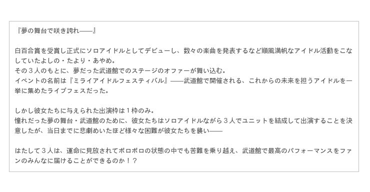 よしの・たより・あやめ、3人のアイドルたちが初めてユニットを組む「ミライフェス編」のストーリーと連動したアイドル楽曲のリリースが決定いたしました。