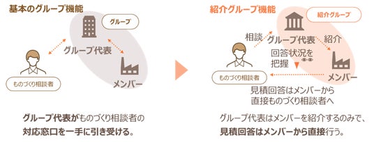 自治体などの公的機関や公共的団体が「紹介グループ」を構成することで、全国のものづくり相談者から相談を受け付け、地域内の事業者に紹介することができます。また、他の地域のグループにも相互に見積依頼が可能となり、広域連携を実現します。さらに、紹介グループのメンバー同士で見積依頼・回答が無料でできるため、地域内の事業者間交流が活性化されることが期待されます。