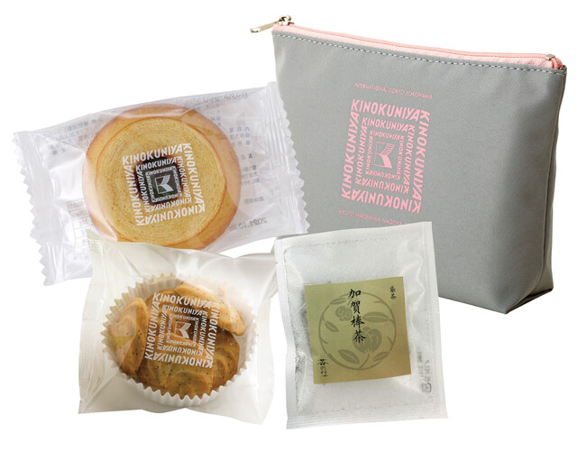スペシャル紅茶クッキー(30g)、バウムクーヘン(プレーン)、加賀棒茶(2包入)、ポーチ(グレーまたはベージュ)