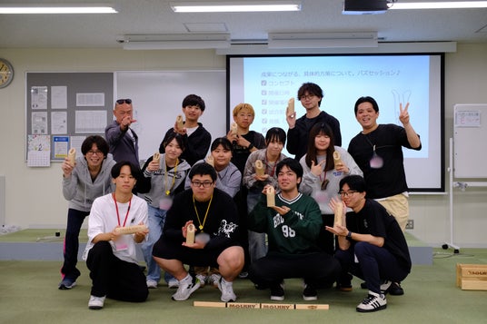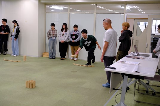 当日は、麻生医療福祉&保育専門学校(福岡市)にて、学生8名と教員2名、春一番のメンバー4名が参加。モルックの体験に加え、チーム対抗戦やルール説明などを通して、競技の楽しさを体感しました。