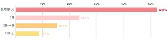 アンケートによれば、受け取るまでの時間として最も多かったのは「数時間以内(52.3%)」であった。そこから、「1日(23.6%)」、「2日~4日(15.4%)」が続き、「5日以上」かかった利用者はわずか8.7%に留まった。