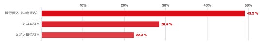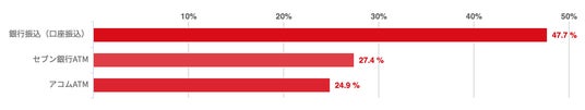 アンケートによれば、「銀行振込(49.2%)」を選んだ人が最も多く、次いで「アコムATM(28.4%)」が利用されていることが明らかとなった。また、「セブン銀行ATM」も一定数(22.3%)の回答者から選ばれている。