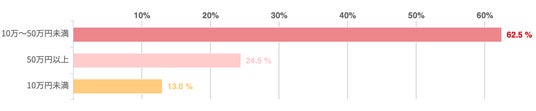 アンケートによれば、アコムの借入金額としては、「10万円~50万円未満」が62.5%で圧倒的多数を占める結果となった。次いで、「50万円以上」が24.5%となり、「10万円未満」が13.0%で最も少なくなった。