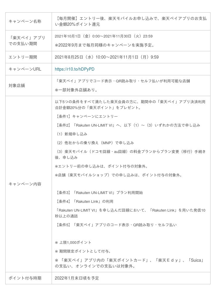 また、「楽天モバイル」と初の1年間共同企画のキャンペーンも実施します。「楽天ペイ」アプリ利用者は、キャンペーンエントリー後に料金プラン「Rakuten UN-LIMIT VI」を新規で申し込み、スーパーコミュニケーションアプリ「Rakuten Link」を利用すると、申し込み当月と翌月の「楽天ペイ」支払い額20%分のポイント還元(上限1,000ポイント)が受けられます。