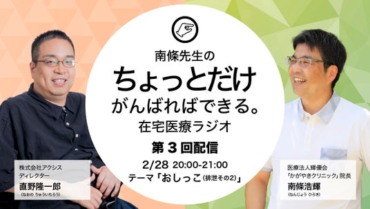 株式会社アクシスと医療法人輝優会かがやきクリニックは、2024年2月28日(水)20時より、医療の最前線から在宅医療のリアルを語る啓発企画として展開している『南條先生のちょっとだけがんばればできる在宅医療ラジオ』の第3回目の配信を実施いたします。
