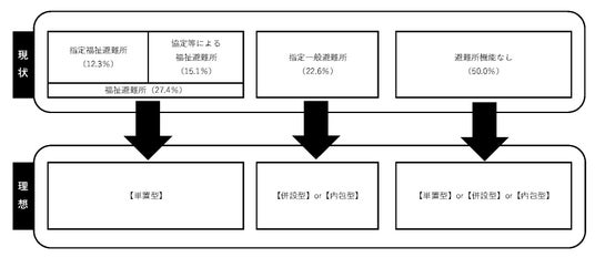 現状の障害者専用・優先スポーツ施設の現状と理想の移行形態をまとめた。すでに福祉避難所となっている27.4%の施設は【単置型】、指定一般避難所となっている22.6%の施設は【併設型】か【内包型】、現在、避難所機能を有していない50%の施設は各施設が保有する付帯施設の状況等により【単置型】【併設型】【内包型】のいずれかで検討することができる。