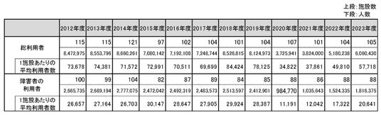 障害者の総利用者数(のべ人数)は、2019年度までは250万人前後で推移していた。コロナ禍に98万人まで減少したが、2022年度には152万人、2023年度には181万人を超えるまで回復した。1施設あたりの平均利用者数をみると、2018年度が29,924人と最も多く、コロナ禍で1万人台まで減少したが、2023年度に2万人を超えるまで回復した。