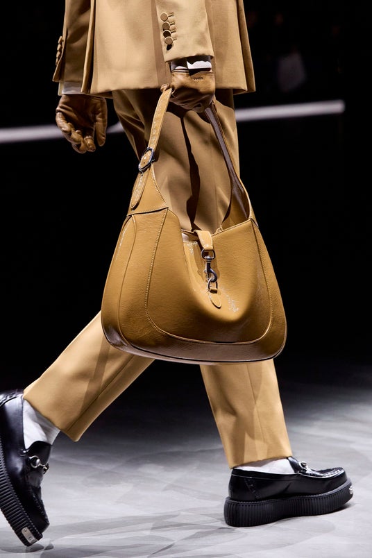 さらにウィメンズのランウェイに登場したスナップフック クロージャーのジャッキー バッグはより大きいサイズとなり、シルバーのマリナ チェーン ネックレスはより小さいサイズとなって今回も登場します。グッチの美の伝統を受け継ぐシルクスカーフも、ジャケットやコートに合わせてアイコニックなスナップフックで留めるといったエレガントな解釈により、新たな方向への第一歩を踏み出します。