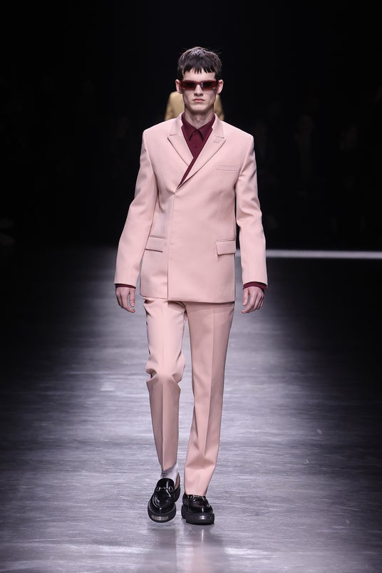 フォーマルウェアでは、2つのダブルブレスト ジャケットがシグネチャー シルエットとして登場します。そのひとつはぴったりとしたフィット感のジャケットで、クロップド パンツと組み合わせています。