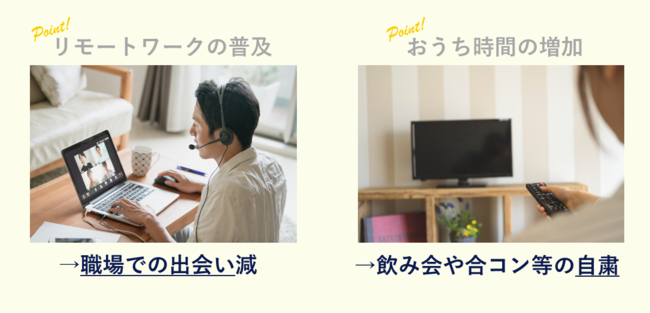 日本の婚姻件数は1972年をピークに年々減少しています。結婚に対する価値観の多様化に加えて、近年は新型コロナウイルス感染症の影響によるテレワークの普及などにより「職場での出会い」も減少し、また外出規制などによる「飲み会」や「合コン」などの自粛も少なからず「出会いの機会の減少」「婚姻件数の減少」に影響していると考えております。