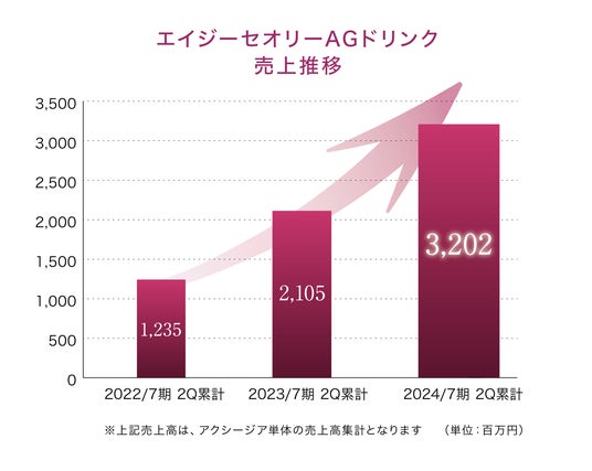 「エイジーセオリー AGドリンク」は、若々しさをサポートする美容ドリンクとして 2016 年 8月に発売して以来、累計 150 万箱*³ を販売している人気シリーズです。「エイジーセオリー AGドリンクX」は、2023年4月にアクシージア史上最高処方として大幅にリニューアルした商品。「AGドリンクX」を含む「AGドリンク」シリーズの売上は大きく拡大を続けており、特に2024 年 7 月期 2Q累計の売上は、前年同期比 52.1 %増を達成し、業界全体で処理水放出の影響がある中でも事業環境に左右されず好調に推移しております。