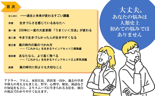 その方法を、アドラー、フロム、本居宣長、渋沢栄一、ほか、過去の学者や偉人の考え方もまじえ、哲学、心理学、歴史、寓話などの知見をもとに、独自の視点でわかりやすく伝えます。「大丈夫。あなたの悩みは人類史上初めての悩みではありません」。「風の時代」に自分らしく生きるための方法を、今までの常識にとらわれない大学の学長が教えます。