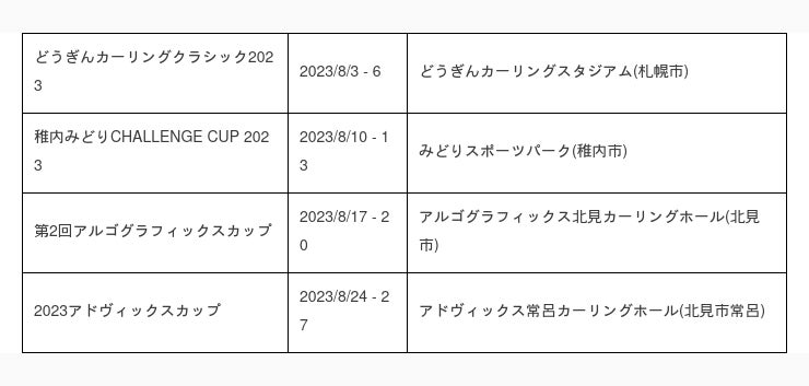 ツアーは道内の4つの大会「どうぎんカーリングクラシック2023」、「稚内みどりCHALLENGE CUP 2023」、「第2回アルゴグラフィックスカップ」、「2023アドヴィックスカップ」で構成されており、World Curling Federation Tour(WCFT) が定める参加チームや賞金額をそれぞれ満たし、国際大会としてさらなる発展が見込まれます。