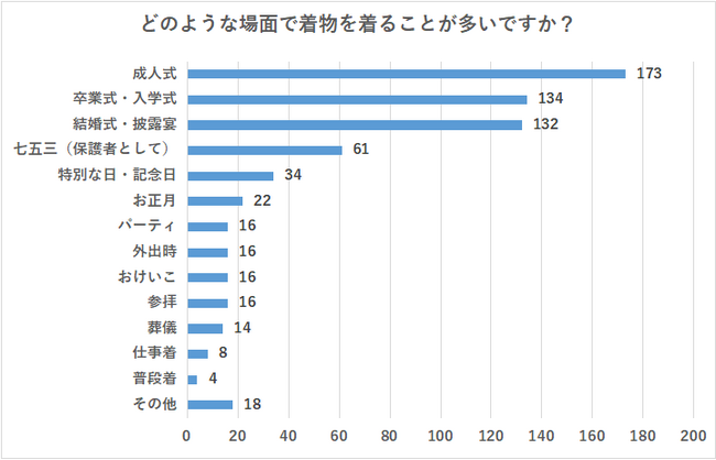 今回、「どのような場面で着物を着ることが多いですか?」という質問をしたところ、「成人式」と回答した方が最も多い結果となりました。