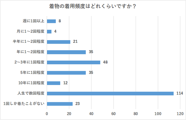 ある程度着物を着用する方でも、「年に1~2回程度」の方から「5年に1回程度」が大半であり、一般的に見ても決して頻度が高いとは言えません。