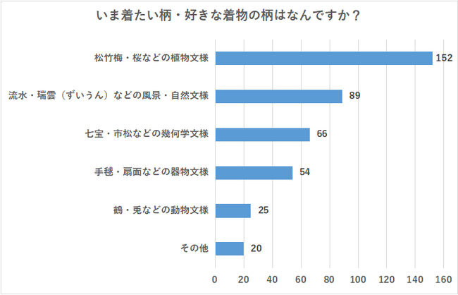 今回、いま着たい着物の柄・好きな柄について質問したところ、松竹梅・桜などの植物文様が一番多くの票を集めました。