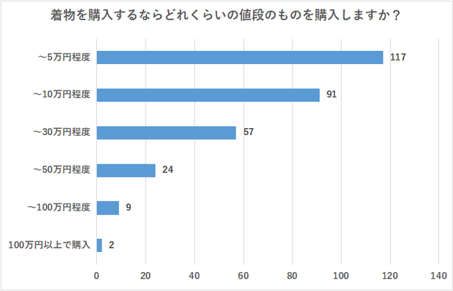 「着物を購入するならどれくらいの値段のものを購入しますか?」という設問に対して、「~5万円程度」と回答した方が多い結果となりました。