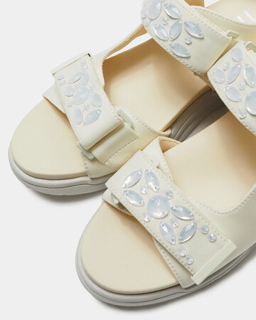 4.足に当たる部分にはやわらかなクッションが入っており、母趾から小趾にかけての足関節部をしっかりとホールドするカッティングです。肌なじみの良いオフホワイトとクールなブラックはどちらもトーナルな色使いで、職人が一つ一つ手作業で取り付けているビジューの装飾との絶妙なバランスが気品を底上げします。