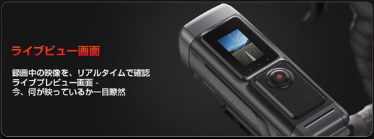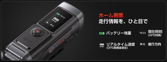 スワイプ操作対応のディスプレイをカメラ本体に搭載。Wi-Fi・GPS・解像度などの設定をスマートフォンアプリを開かずにその場で変更できます。GPS連動によるリアルタイム速度・進行方向表示にも対応しています。