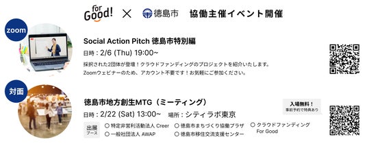 内容:特定非営利活動法人Creer及び一般社団法人AWAPが、クラウドファンディングで取り組もうと しているSDGs推進まちづくり活動について紹介するとともに、それぞれの支援者や協力者に参加していただき応援メッセージをいただきます。