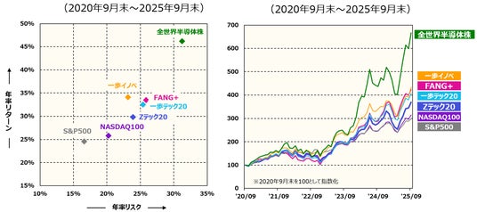 ※FANG+(NYSE FANG+指数)、一歩イノベ(Mirae Asset Global Innovative Bluechip Top 10+ Index)、一歩テック20(FactSet US Tech Top 20指数)、NASDAQ100(NASDAQ100指数)、S&P500(S&P500指数)、Zテック20(シミュレーションと実績)、全世界半導体株(NYSE FactSet 全世界半導体株インデックス)を使用。
