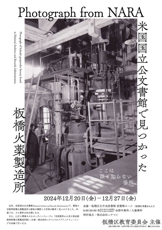 板橋区教育委員会は、令和6年12月20日(金)から27日(金)まで、NARA(米国国立公文書館)で発見された、GHQによる日本占領期(1945年~1952年ごろ)の「旧板橋火薬製造所」に関わる貴重な写真史料の展示会「Photograph from NARA」を、区立中央図書館で開催しています。