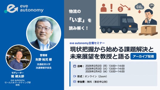 株式会社eve autonomy(イヴ・オートノミー、本社:静岡県磐田市、代表取締役CEO:星野亮介、以下「eve autonomy」)は、物流研究の第一人者であり、流通経済大学 流通情報学部長、『間違いだらけの日本の物流』の著者としても知られる矢野裕児氏を講師に迎え、物流業界の現状把握と課題解決の糸口を探るオンライン対談ウェビナーを、過去開催内容をもとにしたアーカイブ配信形式にて、2026年2月2日から4日までの3日間限定で開催いたします。