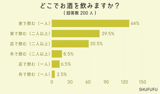 どこでお酒を飲むかに関しては1位「家で飲む(一人)(64%)」、2位「家で飲む(二人以上)(39.5%)」でした。人数を問わずお酒は家で飲むという方が圧倒的に多かったです。お店で飲むより値段が抑えられますし、飲酒量の調節やそのまますぐに寝れるなどの利便性の面でも都合が良いのかもしれませんね。