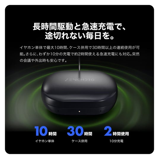 イヤホン単体で最大10時間、ケース併用で最大30時間の連続使用が可能。Bluetooth 6.0、ハイレゾ音源(LDAC, AAC, SBC対応)を搭載により、高い接続安定性とクリアな音質を提供します。