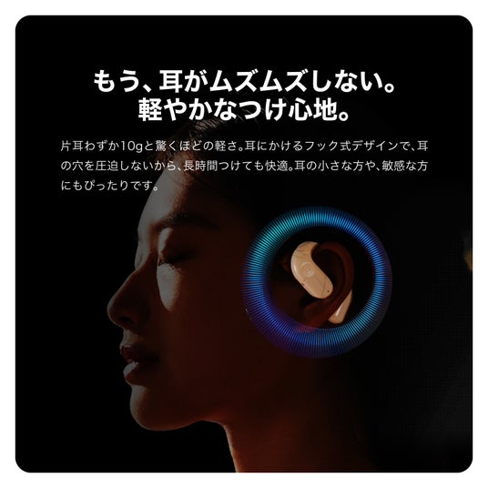 耳穴を塞がないため、長時間の使用でも圧迫感が少なく快適。片耳約10gの軽量設計で、周囲の音も自然に聞くことができます。