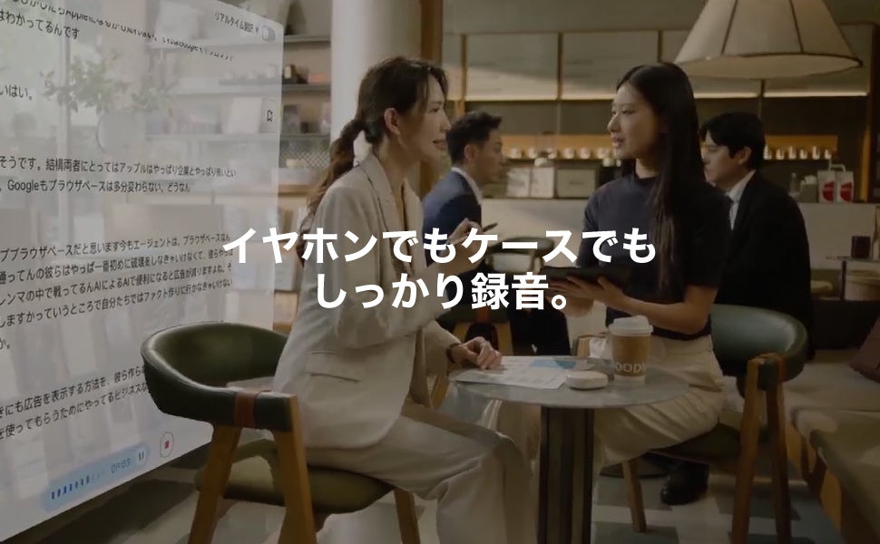 充電ケースには独立したマイクと録音用チップが内蔵。イヤホンを装着しにくい対面会議でも、テーブルに置いてボタンを押すと自然に録音を開始します。話し終える頃にはNotta AIが自動で要約。「議事録作成」から解放され、「本質的な議論」へ。