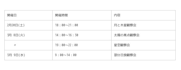 ・「太陽の黒点観察会」「部分日食観察会」では、フィルターを付けた望遠鏡により、直接、太陽を観ることができます。なお、部分日食のピークは11時頃です。次の部分日食が3年後となりますので、ぜひ、この機会にご覧ください。