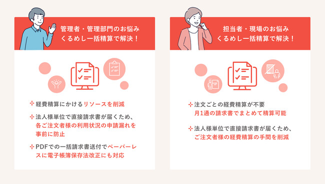 これまで、企業内の食事発注の担当者は、注文ごとに発行される複数の請求書、領収書を管理することで経費精算の手続きが煩雑化し、経理担当者は紙の書類を漏れなく管理するため、経費精算の工数が増えるなどの課題を抱えていました。くるめし弁当では、これらの課題に対応し、より効率的な食事発注をサポートするため、「くるめし一括精算」のサービスをリリースしました。