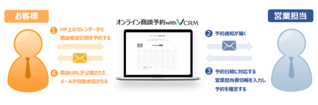 『オンライン商談予約 with VCRM』は、企業側が商談受付可能な時間を設定するだけで、お客様が自らホームページ経由で商談の希望日時を予約することが可能となります。そのため、企業側がお客様とスケジュールを調整する手間が不要となり、企業側が担当セールスをアサインし予約を確定すると同時に、本予約システムが自動的に「VCRM(ブイシーアールエム)」(以下、VCRM)のルーム予約を行い商談URLが記載されたメールをお客様に自動送信することができます。