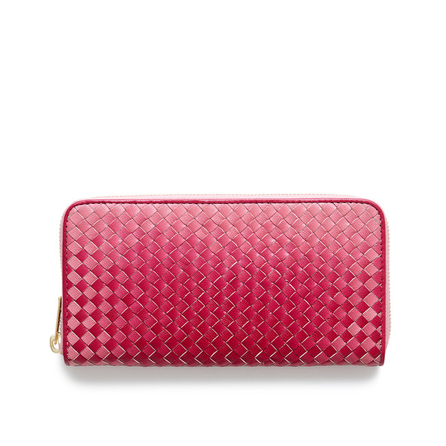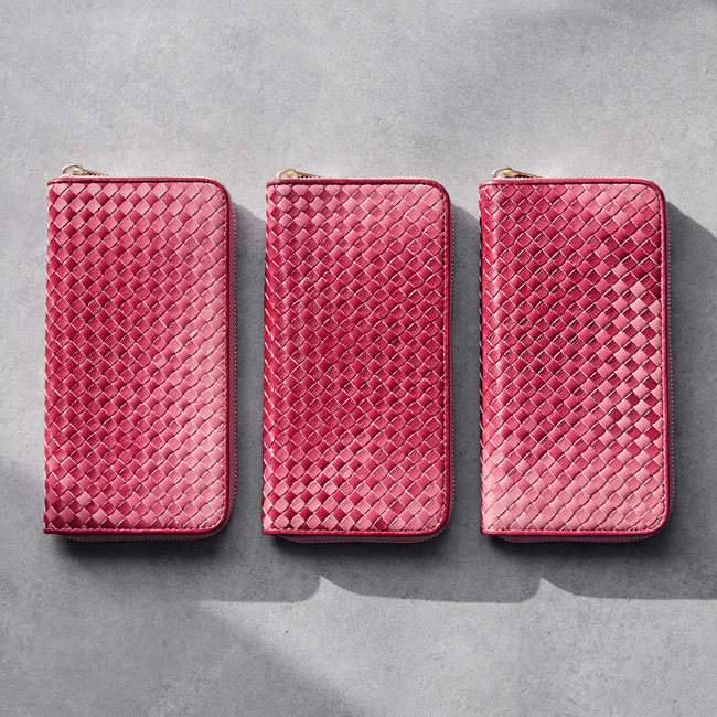四季の移り変わりを、鮮やかなグラデーションレザーで表現したマザーハウスのイロドリシリーズ(https://www.mother-house.jp/event-campaign/irodori-series/)。そのイロドリレザーをメッシュにすることで、美しいランダムな編み模様が生まれました。お財布に現れる編み模様は、一つとして同じものがありません。